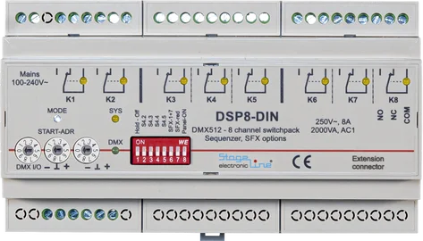 Das DSP8-DIN, ein DMX512 gesteuertes, 8 Kanal Relaismodul, ist die Gehäuseversion des DSP8-pcb für direkte Montage auf TS 35 DIN-Schiene. Jeder der 8 Relaisausgänge ist ein potentialfreier Umschaltkontakt für 230V~/ 8A Dauer- und max. 30A Einschaltstrom. Alle Bedienelemente und Anzeigen auf der Frontbelende.