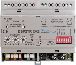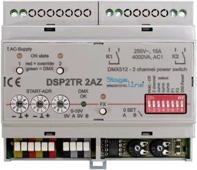 Das DSP2TR-2AZ ist ein DMX512 gesteuertes Spezialschaltpack mit zwei analogen 0-10V Ausgängen. Das Besondere dieser Schaltung besteht zum einen darin, hohe Einschaltstromimpulse, wie sie oft bei elektronischen Netz- / Vorschaltgeräten in LED-Anwendungen zum Einsatz kommen, durch kontrolliertes Einschalten im Netzspannungs-Nulldurchgang, deutlich zu reduzieren. Dadurch lassen sich oft mehr Vorschaltgeräte / (steuerbare) Netzgeräte an einem Sicherungsautomaten betreiben als es ohne Reduzierung der Einschaltstromspitzen möglich wäre.