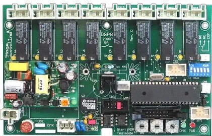 Das DSP8-pcb ist eine DMX512 gesteuerte, 8 Kanal Relaisplatine mit Wago CageClamp Steckverbindern für jeden der 8 Kreise. Die 8 Relaisausgänge verfügen über je einen potentialfreien Umschaltkontakt für 230V~/ 8A Dauer- und max. 30A Einschaltstrom.