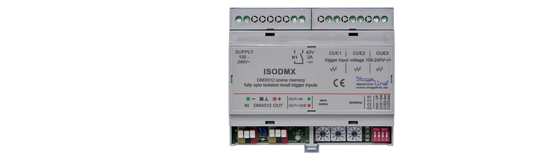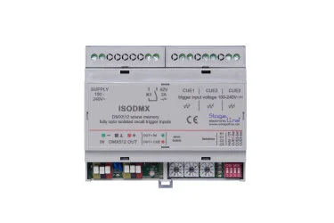 Das ISODMX kann bis zu drei DMX512 Szenen speichern und auf Anforderung durch den jeweiligen Triggereingang in eine DMX512 Linie „mergen“ oder exklusiv einbinden. Die Ansteuerung kann durch den Lichtschalter, Lichttaster oder z.B. einem Infrarot-Bewegungsmelder erfolgen. Die Triggereingänge sind untereinander und von der Schaltung vollständig elektrisch isoliert. Die anzulegende Steuerspannung darf zwischen 100V und 240V~/= betragen. Eine Kleinspannungsversion ist ebenfalls lieferbar.