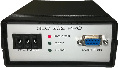 Der SLC232PRO, als Nachfolger unseres SLC232, ist weiterhin ein Protokollwandler der über die gute alte RS232 Schnittstelle mit einem PC oder einer Maschinensteuerung verbunden wird und direkt über ASCII Kommandos Daten auf einer DMX512 Schnittstelle ausgibt.