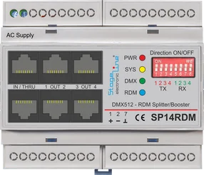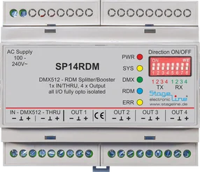 Der SP14RDM ist ein DMX512 Splitter & Booster im 6TE Hutschienengehäuse. Er verteilt und verstärkt eine DMX512 Linie in 4 neue, vollständig gegeneinander isolierte Linien und unterstützt das RDM Protokoll zur Kommunikation zwischen einem RDM fähigen Lichtstellpult und den angeschlossenen RDM fähigen Lampen.