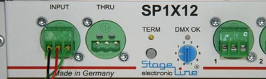 Der SP1X12 kann mit diversen Verhalten auf DMX512 Fehler oder auf Schnittstellenausfall reagieren und kann bei Bedarf mit einem reduzierten DMX512 Timing senden. Eine LED signalisiert den Betriebszustand und ein gültiges DMX512 Signal.
