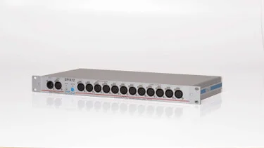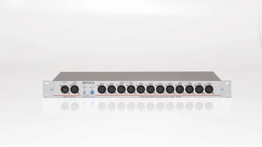 Der SP1X12 ist ein DMX512 Splitter & Booster im 19“ 1HE Gehäuse. Er verteilt und verstärkt eine DMX512 Linie in 12 neue, vollständig elektrisch, gegeneinander isolierte Linien. Alle DMX512 Anschlüsse sind wahlweise mit Neutrik XLR5 pol, XLR3 pol oder RJ45 Steckverbindern ausgeführt. Auf Anfrage stehen auch Phönix Terminalsteckverbinder für den direkten Drahtanschluss zur Auswahl. Der DMX512 Eingang hat einen zuschaltbaren Abschlusswiderstand und eine THRU Buchse.